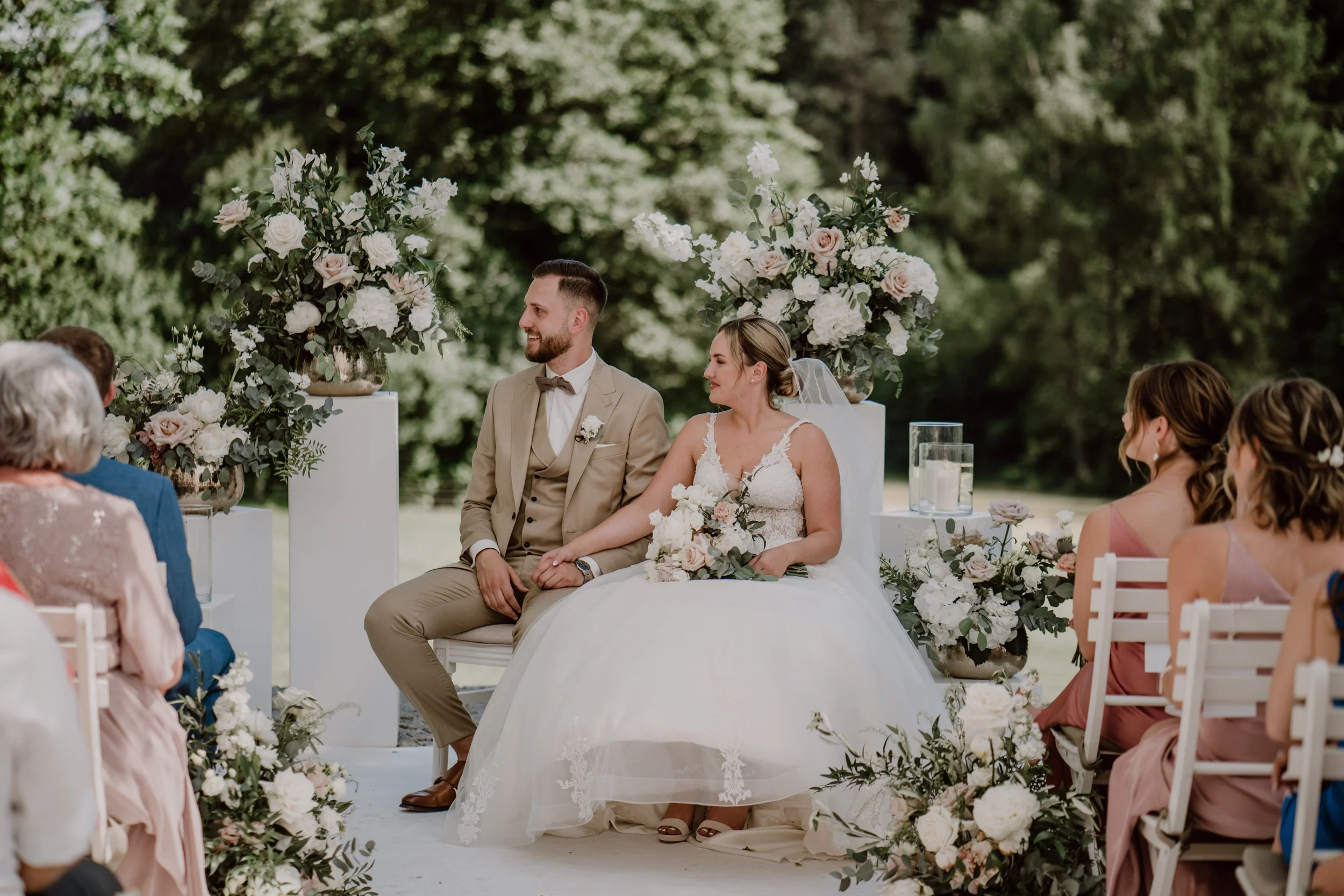 Ob es vielleicht an den “Wodka-Boys” lag? Neben den klassischen Blumenkindern gab es nämlich beim Einzug zur freien Trauung eine FSK18 Version. Es wurden Wodka-Shots verteilt! Immer, wenn ich denke ich habe schon alles erlebt, passiert sowas lustiges. Aber auch der emotionale Teil kam nicht zu kurz. Vor allem der First Look von Evelyn und Dennis ist mir in Erinnerung geblieben. Genau wegen solchen Momenten finde ich den First Look einfach nur wunderschön. Ein paar Momente nur zu Zweit an diesem aufregenden Tag - aber seht selbst: